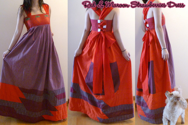 This dress is cute!! Fully lined curtain style bodice is made of a red cotton twill. Bodice is meant to sit above your bust. I gave the front 3 sweet strawberry appliques. I love strawberries :) The straps lace down the back through 3 sets of loops for an adjustable fit. They are nice and wide and won't dig into your shoulders. I trimmed the straps with decorative stitching. The back features my unique smocked backing so you can wear a bra with the dress (if you want)! The skirting of the dress a wonderful pink checked fabric (see the close-up pictures!) and the bottom is slanted patchworked red and maroon cotton blend fabrics.