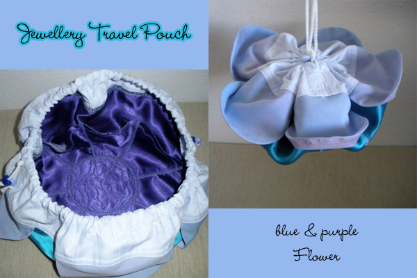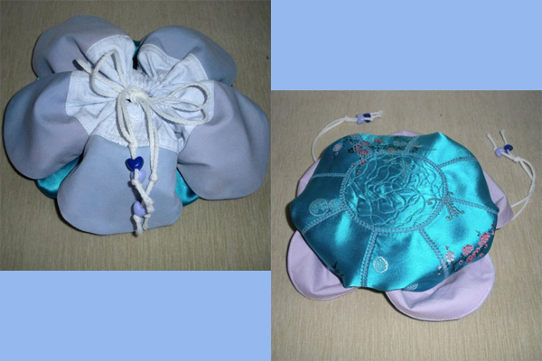 This beautiful pouch is done in various blue and purple fabrics, including a gorgeous brocade and a silk charmeuse. When cinched closed, the top turns into a flower...so pretty and perfect.