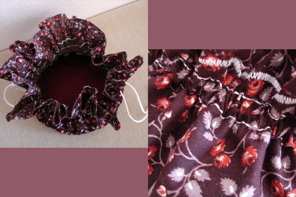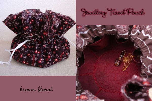 For this pouch, I used a lovely floral print quilter's cotton, a brown cotton solid, and a maroon speckled cotton.