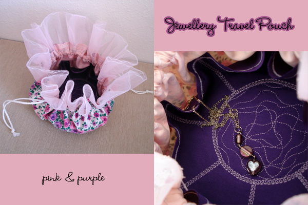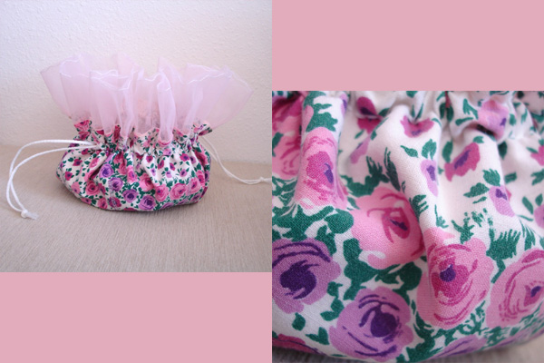 This pouch is so pretty! I used a variety of pink and purple cottons and a light pink organza for the top (repurposed from one of my wedding chair sashes!).