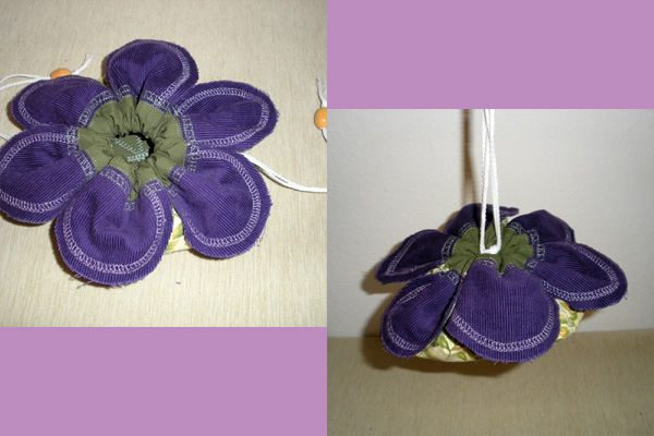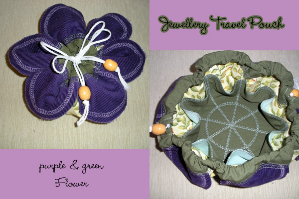 This beautiful pouch is done in various shades of greens and purples. When cinched closed, the top turns into a flower...so pretty and perfect.